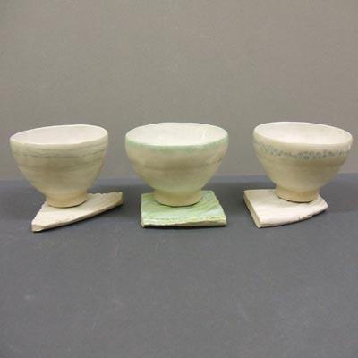 Stoneware partially glazed pinched tea bowls with glazed tea mats -