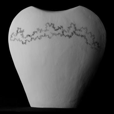 Detail of unglazed, carved stoneware plate
